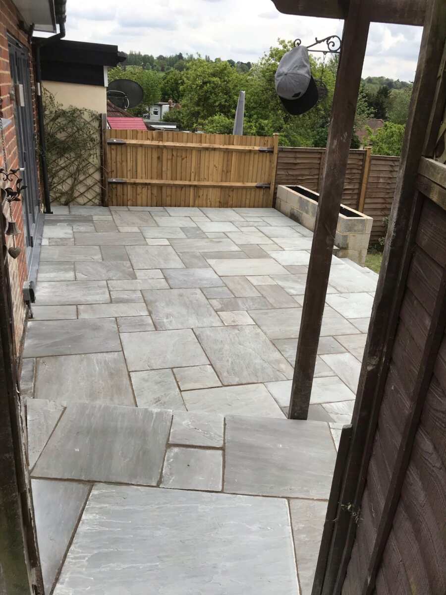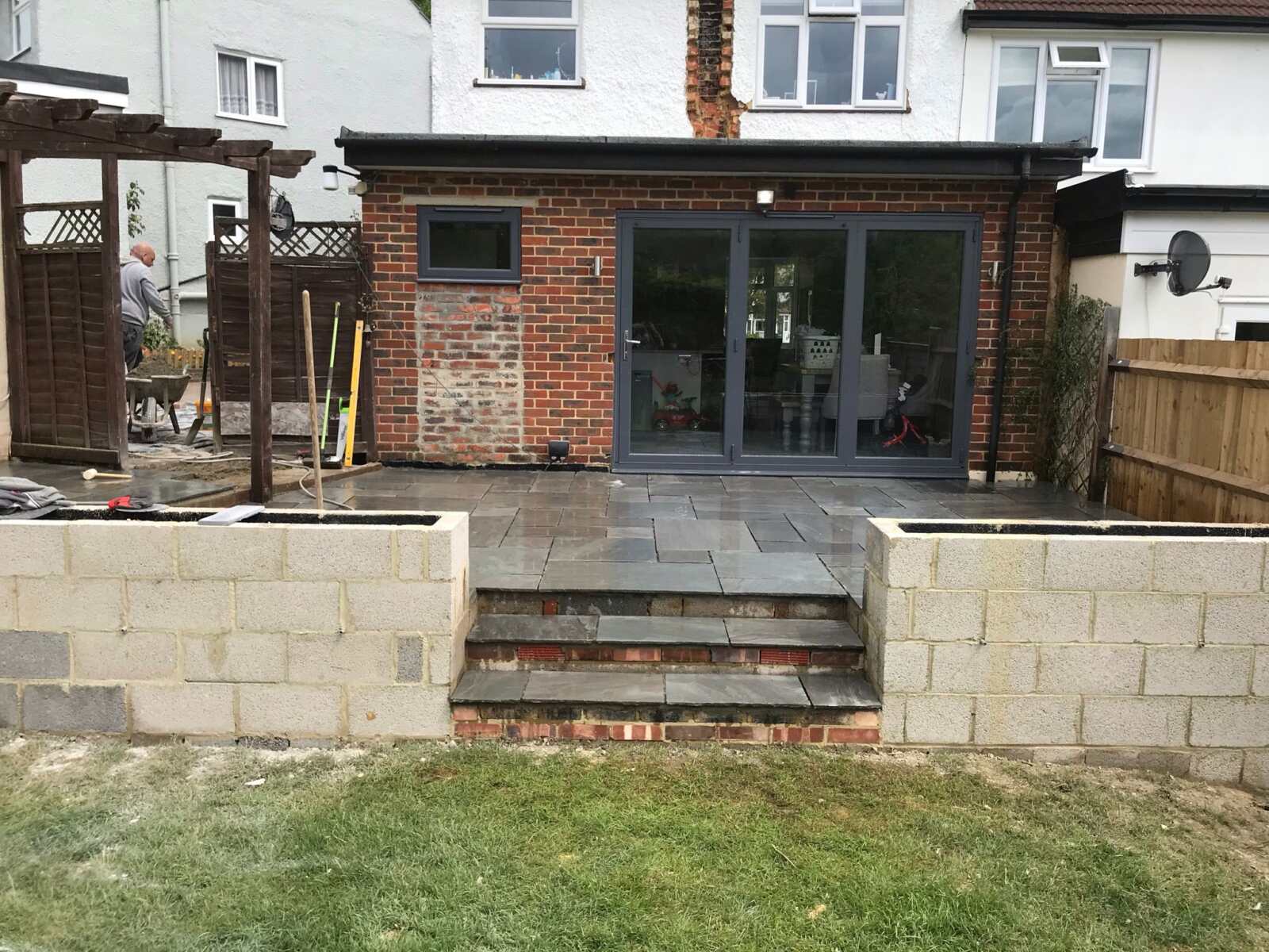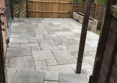 Kandala Grey Indian Sandstone Patio With Concrete Wall Retainer With Built In Flower Beds